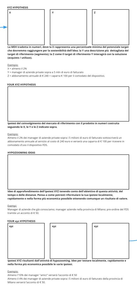 Tutte le idee emerse nel brainstorming vanno inserite nel riquadro Hypozooming Ideas e serviranno per riformulare la XYZ Hypothesis in versioni più “alla mano” denominate per l’appunto “Your xyz Hypothesis“.