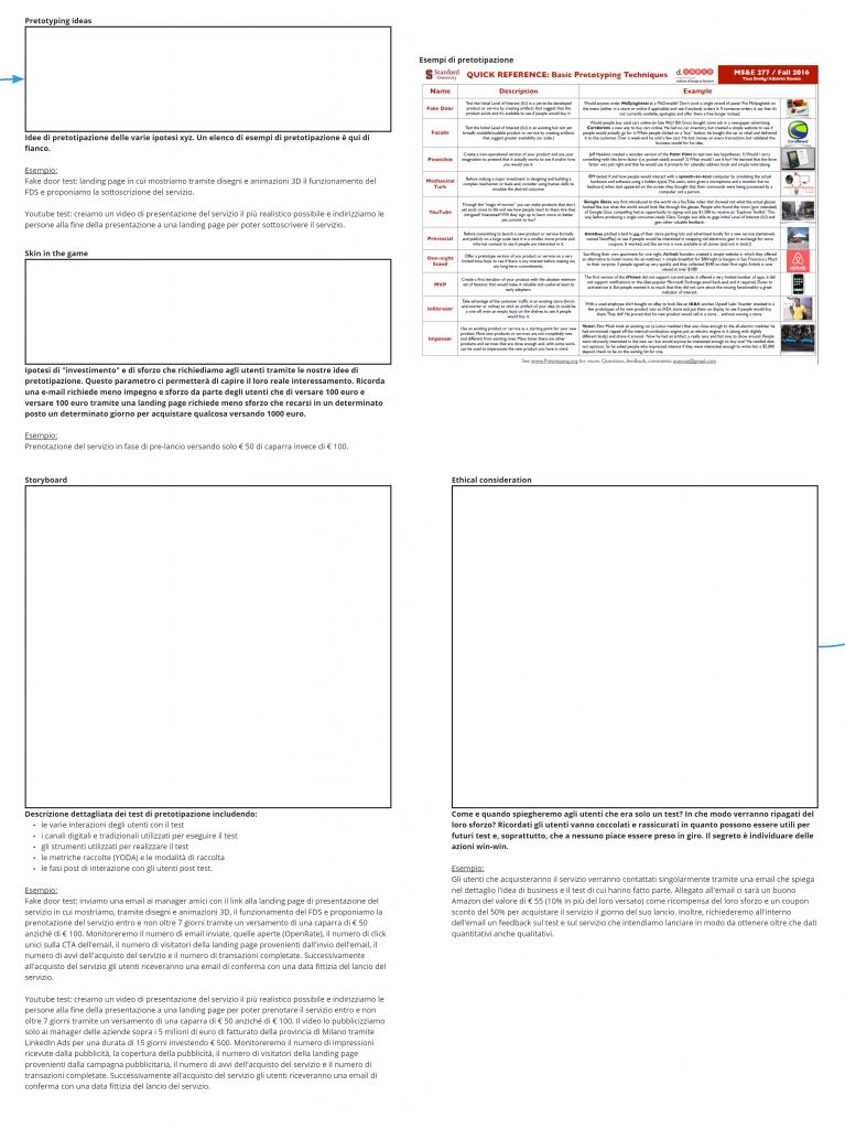 Attraverso un brainstorming con tutto il team, si andranno ad elaborare una serie di idee di pretotipazione sulla base delle informazioni che abbiamo inserito nei riquadri xyz Hypothesis del precedente step.