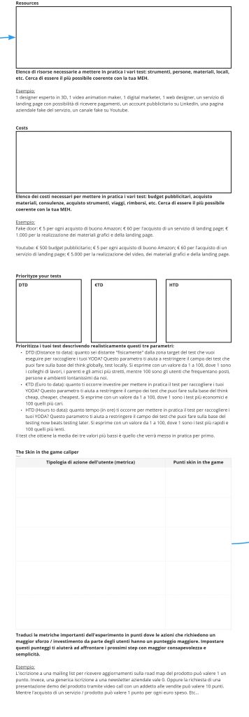 Ecco, quindi, il box Ethical consideration. Qui dobbiamo inserire come e quando spieghiamo agli utenti che sono stati “vittime” di un test di pretotipazione e come li ripaghiamo dello sforzo. Sì, perché più alto è lo skin in the game che richiediamo agli utenti e più alta dovrà essere la ricompensa per loro.