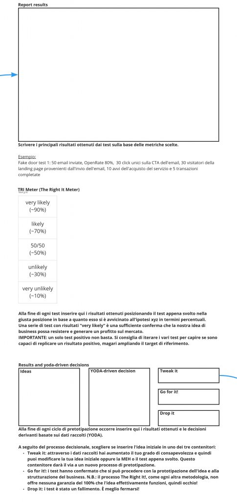 Qui si andranno ad inserire idee e riflessioni sull’esperimento eseguito, le decisioni derivanti dai dati raccolti – YODa – e impostati i prossimi passi: